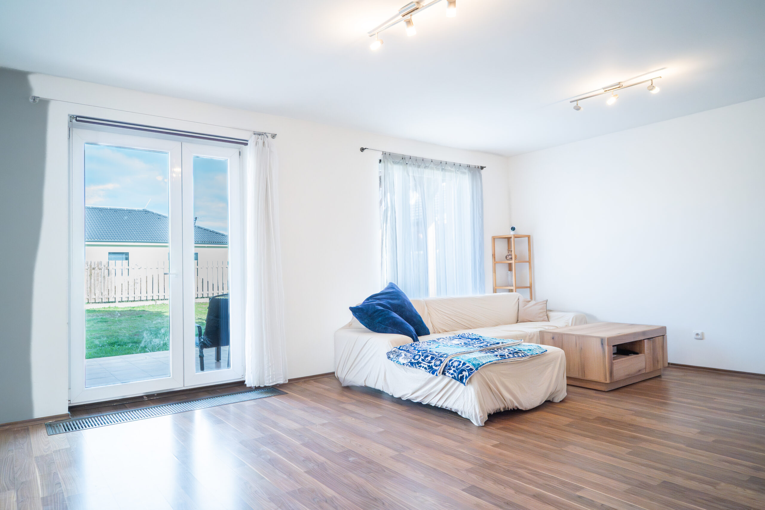 Dům působí velmi příjemně, vzdušně a zároveň útulně. Obývací pokoj nabízí dostatek prostoru pro rodinný život i odpočinek a díky velkým oknům je krásně prosvětlený po celý den. Přímý vstup na terasu a zahradu přirozeně propojuje interiér s venkovním prostorem a vytváří ideální místo pro každodenní relaxaci.