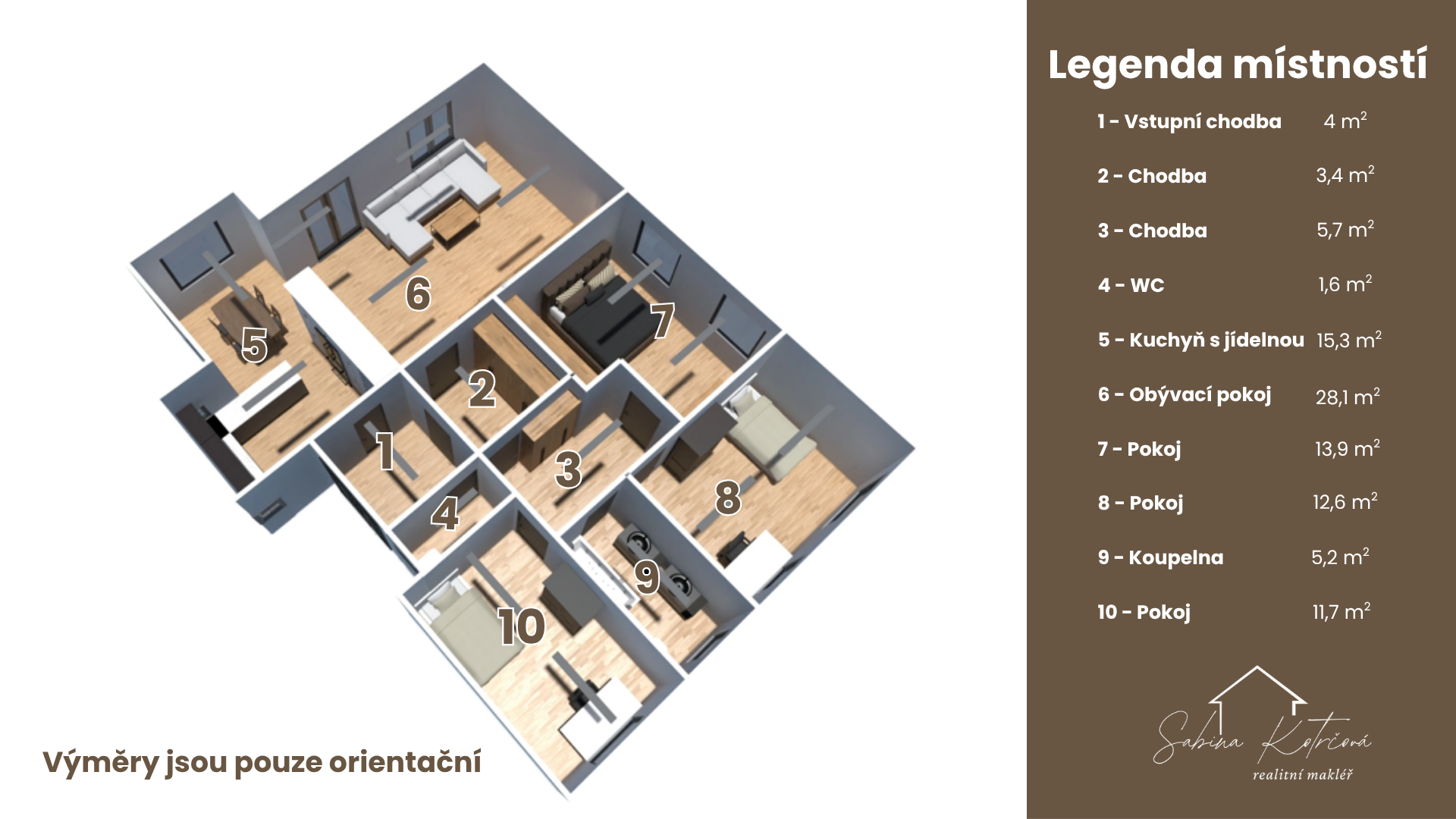 Dům nabízí dostatek soukromí pro každého člena domácnosti – jednotlivé pokoje lze využít jako ložnici, dětské pokoje nebo pracovnu. Dispozice je praktická a dobře promyšlená, takže si prostor snadno přizpůsobíte podle vlastních potřeb.